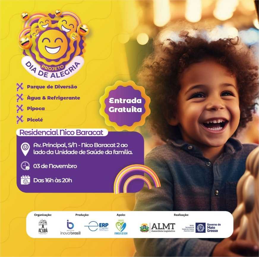 Neste domingo (03), a partir das 16h, no Residencial Nico Baracat, localizado na Avenida Principal, ao lado da Unidade de Saúde da família, em Cuiabá acontecerá o projeto “Dia de Alegria”, com o propósito de reunir as crianças da região em uma grande festa gratuita.