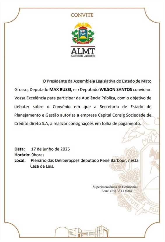 A Assembleia Legislativa, por meio do deputado estadual Wilson Santos (PSD), vai realizar audiência pública para debater sobre o convênio da empresa consignatária Capital Consig com o Governo de Mato Grosso, por meio da Secretaria Estadual de Planejamento e Gestão (Seplag) que controla 28 bancos autorizados a realizar empréstimos consignados, 12 a operar com cartão de crédito consignado e 25 com cartão de benefício.
