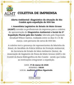 A Assembleia Legislativa do Estado de Mato Grosso (ALMT) convida os profissionais da imprensa para a coletiva de apresentação do Diagnóstico Ambiental e Social da 3ª Expedição Fluvial pelo Rio Cuiabá, liderada pelo Deputado Estadual Wilson Santos, realizada entre os dias 9 e 13 de março, com percurso de cerca de 900 km – do Rio Manso ao Pantanal.
