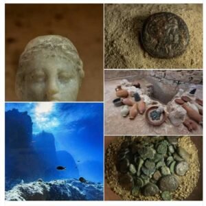 Próximo ao busto feminino, arqueólogos encontraram um fragmento de outra estátua, representando um rei com o “Nemes”, um tradicional adorno faraônico. Além disso, a equipe desenterrou 337 moedas, muitas com imagens de Cleópatra VII, e artefatos como lâmpadas de óleo, um anel de bronze dedicado à deusa Hathor (entidade egípcia com cabeça de vaca) e um amuleto com a inscrição “A justiça de Rá surgiu”.