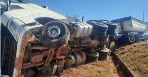 Motorista fica ferido após carreta com carga de pedra brita tombar na BR-364 em Rondonópolis