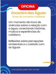 A oficina “Encontro das Águas – roda de conversa mediada” será um espaço de escuta e troca, conectando histórias, memórias e experiências pessoais com a água. A proposta é estimular o diálogo sobre percepções ambientais, especialmente no que diz respeito ao uso cotidiano da água e à necessidade de sua conservação.