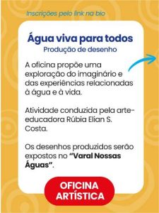 Já na oficina “Produção de desenhos – Água Viva”, os participantes serão convidados a explorar o imaginário e as vivências relacionadas à água por meio da arte. A atividade será conduzida pela arte-educadora Rúbia Elian S. Costa, e os trabalhos produzidos irão compor o “varal nossas águas”, uma exposição coletiva que valoriza diferentes olhares sobre o tema.