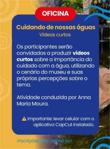 A terceira atividade, “Cuidando de nossas águas – produção de vídeos curtos”, aposta na comunicação digital como ferramenta de conscientização. A partir do cenário do próprio Museu e da relação com o rio, os participantes irão produzir conteúdos audiovisuais com foco em sensibilização e engajamento, incentivando práticas sustentáveis no dia a dia.