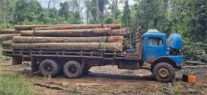 No local de área de preservação permanente, foram encontradas marcas de pneus de caminhões adentrando a mata, além de visualizar alguns caminhões preparados para o transporte de madeira trafegando vazios.