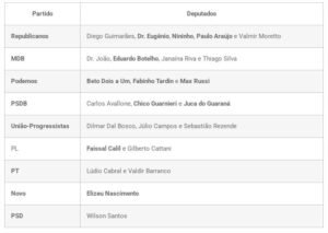 O MDB aparece na sequência com quatro parlamentares: Dr. João, Eduardo Botelho, Janaína Riva e Thiago Silva.