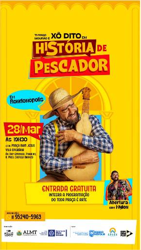 Xô Dito é o personagem icônico do artista Thyago Mourão que comemora 20 anos com a circulação de shows e Oficinas de produção de conteúdo digital gratuita, com o projeto “História de Pescador – Turnê Mato Grosso”. E a população de Tangará da Serra (MT) terá a oportunidade de conferir uma apresentação de humor imperdível, nesta sexta-feira (23.04), no Teatro Municipal-Centro Cultural “Pedro Alberto Tayano Filho”, com a doação de 1kg de alimento não perecível para uma entidade do município. O show abre com o descolado personagem Wylon, sobrinho de Xô Dito, que se destaca pela autoestima inabalável, autoproclamado galã nacional.