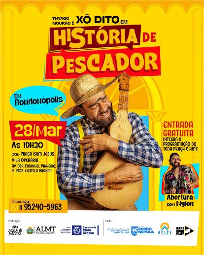 Em duas décadas dedicadas à arte, à cultura popular e à comunicação, Thyago Mourão celebra esta etapa em uma turnê por sete municípios de Mato Grosso com o carismático Xô Dito, levando seus causos cheios de humor, exaltando o linguajar pantaneiro que hipnotiza a plateia, inserindo música autoral com a participação do diretor musical Paulo Monarco.