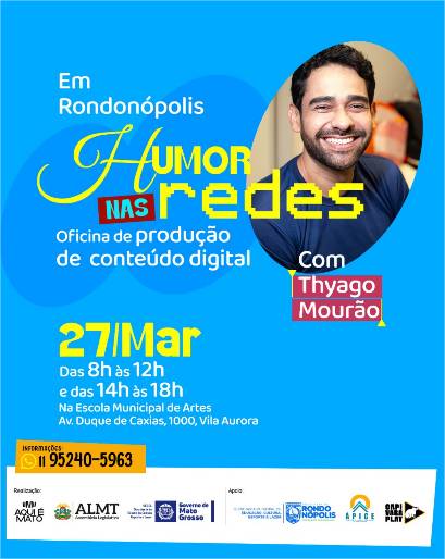 Além do “palco”, o projeto terá uma segunda ação gratuita com a Oficina de produção de conteúdo digital – Humor nas Redes, com inscrições limitadas, ministrada pelo próprio Thyago Mourão. A atividade revela outra vertente do artista, que também atua como comunicador e soma milhares de seguidores nas redes sociais, no Instagram @thyagomourao. Será realizada em dois períodos, no sábado (25.04), das 8h ao meio-dia e das 14h às 18h, também no Centro Cultural de Tangará da Serra.